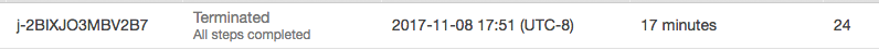 Make sure your cluster is terminated! It should do so if you selected the options above. You should check this each time you look at the HW, just to make sure you dont get charged for leaving a cluster running. Its fine if you see warning (or even occasional error) messages in the logs. If your EMR job finishes successfully, you should see something similar to the below in the main EMR console screen: